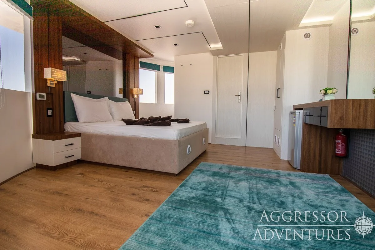 The Red Sea Aggressor IV has 3 master staterooms each with a queen bed and 9 Deluxe staterooms each with two twin beds. The yacht has a beautiful spacious salon, large sun deck with shading, 2 hot tubs, chaise lounges, deck chairs, and a bar. There are 2 bathrooms on the main deck, 1 on the upper deck and 1 on the sun deck.